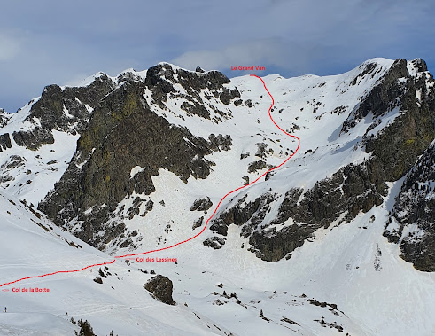 Nous attaquons un passage un plus raide avec enchainement de conversions, merci à Eric et Jérôme pour la trace. Arrivée au point 1965, nous délaissons l’itinéraire du Mont Bellacha qui est un peu long, pour rester sur les pentes peu exposées en direction de la pointe des Marmottes Noires. L’accumulation de neige est assez importante. Le vent nous accueille au sommet, vue 360°, et Combe Bronsin.